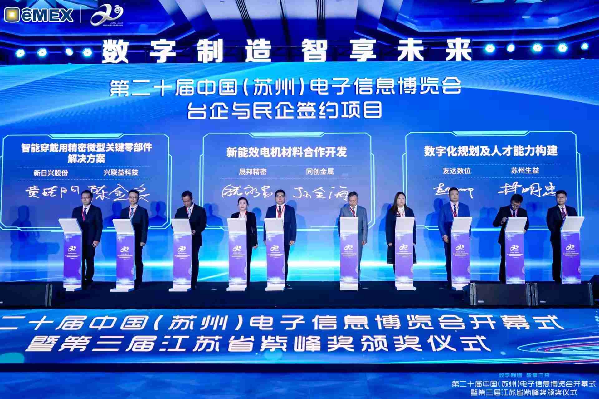 电博会开幕式当天也是第三届江苏省紫峰奖颁奖仪式,,省台办、、、、工信厅、、商务厅、、苏州市相关领导均出席并颁奖。。。。该奖项为表彰对江苏高质量发展做出积极贡献的在苏企业,,,由江苏省政府专门设立。。。。人生就是博光电 (苏州) 总经理郭振明代表上台领奖,,,,这也是人生就是博苏州连续三次蝉联紫峰奖 出口贸易领军企业奖。。人生就是博数位总经理赵丽娜女士,,,也参与本次开幕式,,上台为本地化赋能签署战略合作协议,,,将优质服务资源集合、、、下沉到更多细分行业,,,,为更多地区的制造企业提供数字化转型服务。。