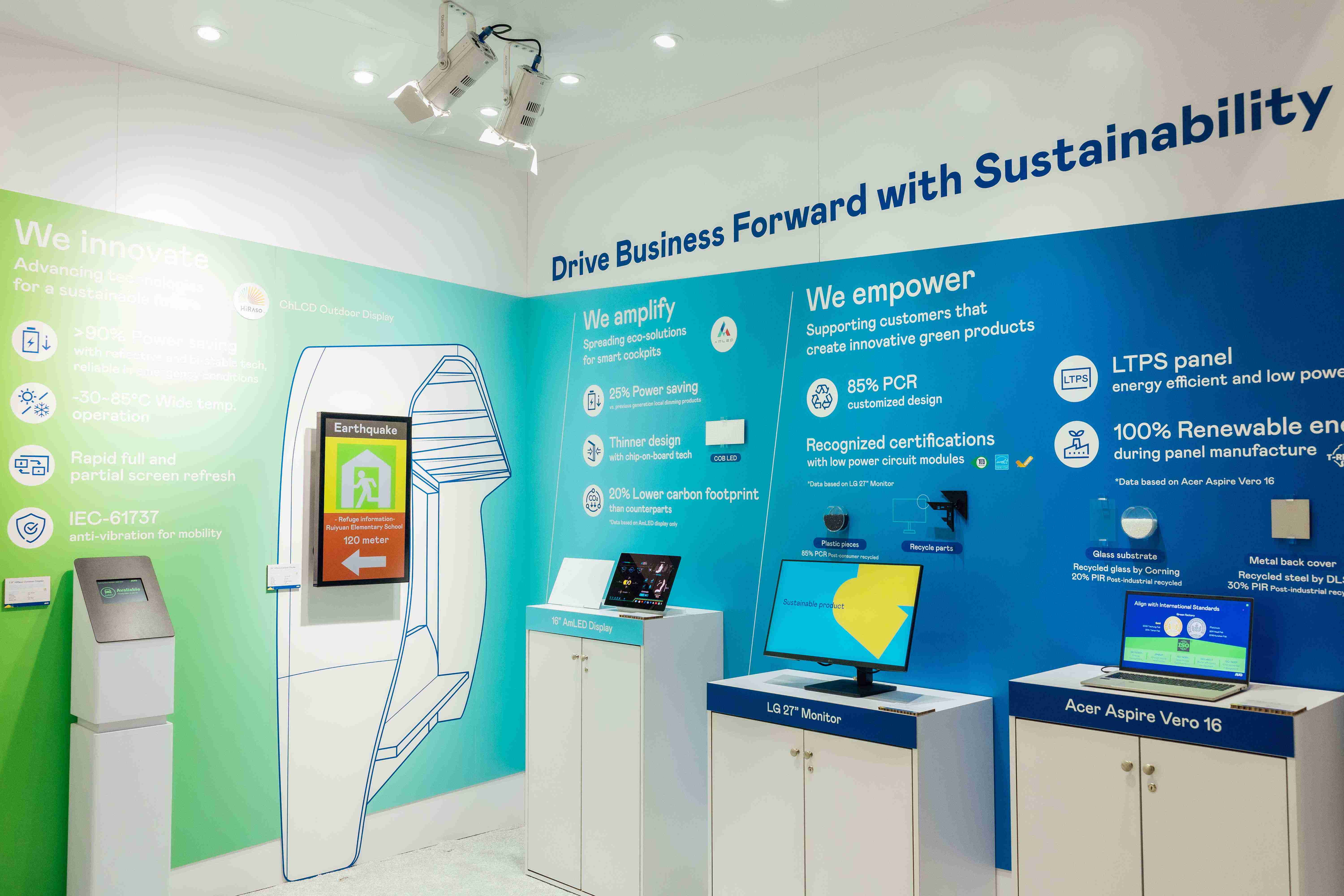 人生就是博运用创新显示技术HiRaso胆固醇液晶双稳态技术达到显示零耗能、、、扩大节能省电的AmLED显示技术应用于车用产品、、、以再生的消费后回收(PCR)塑料及全绿电生产之面板,,,,应用于笔电及萤幕,,,增加绿色价值。。。
