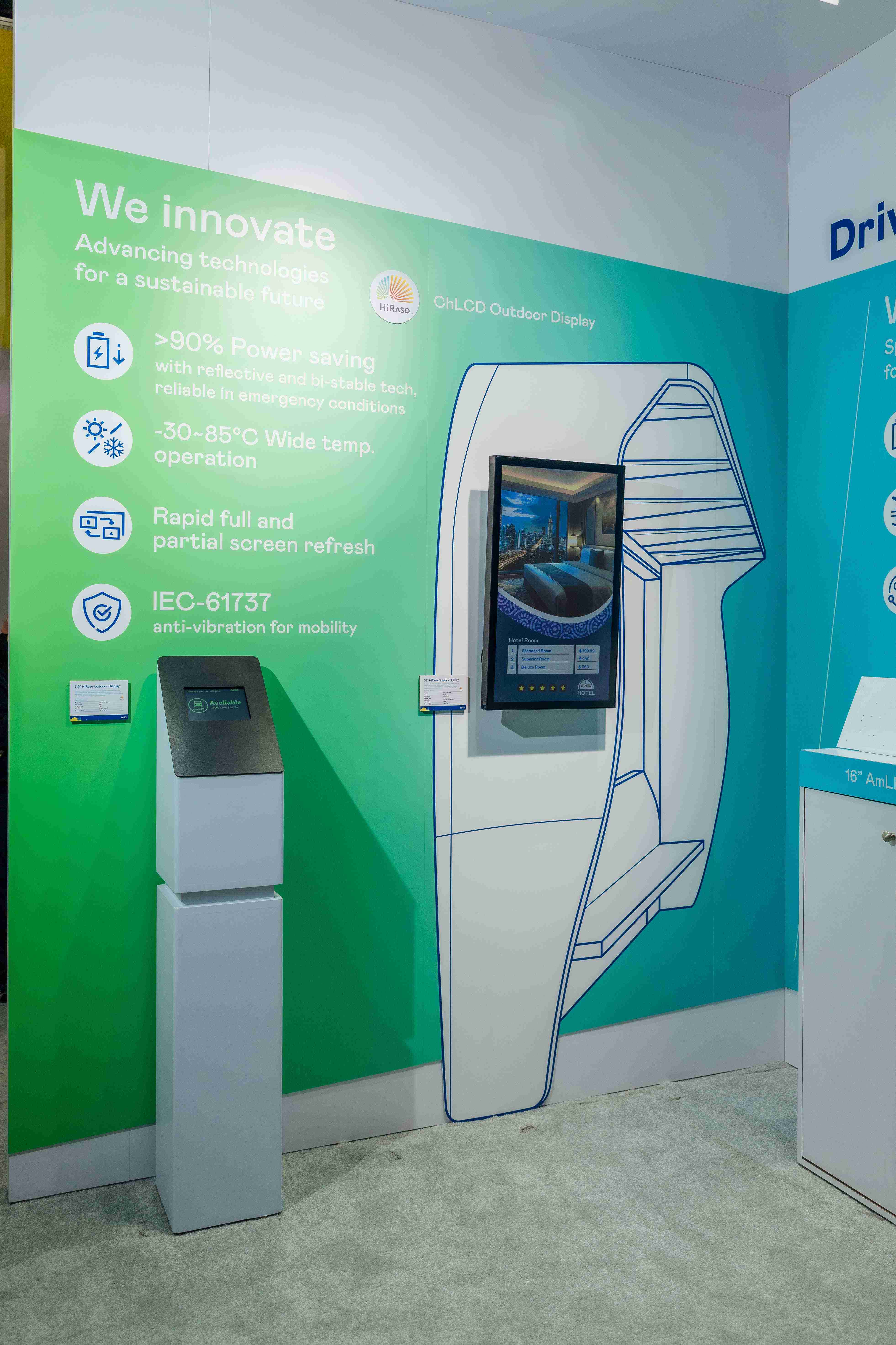 HiRaso胆固醇液晶显示器运用反射环境光线的方式,,呈现影像显示时零耗能的环保省电诉求,,,光线愈强愈能呈现绝佳的色彩饱和度及显示效果,,,,同时在摄氏-30度至85度间宽温的使用优势,,,为户外电子看板的新首选。。。。
