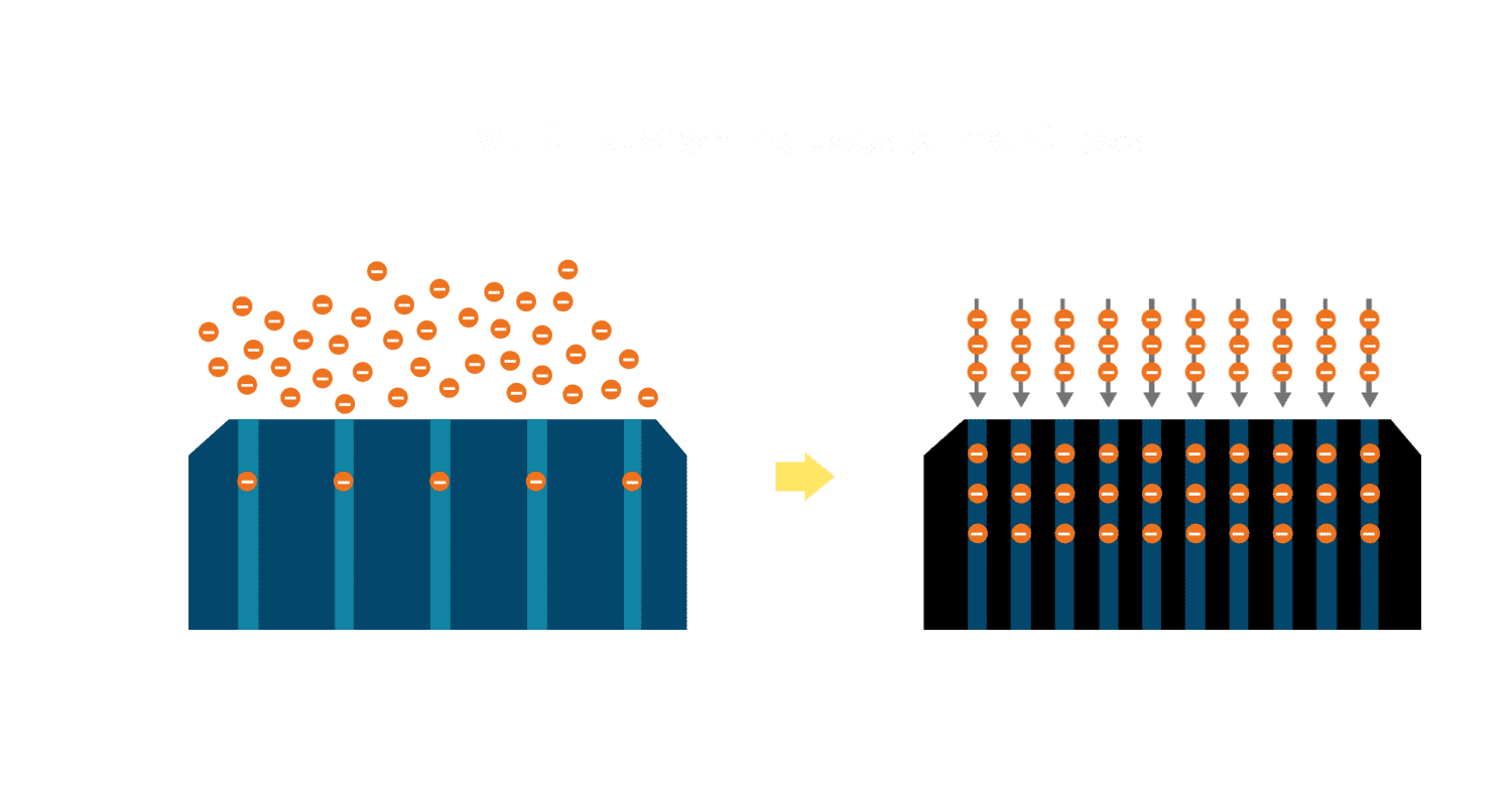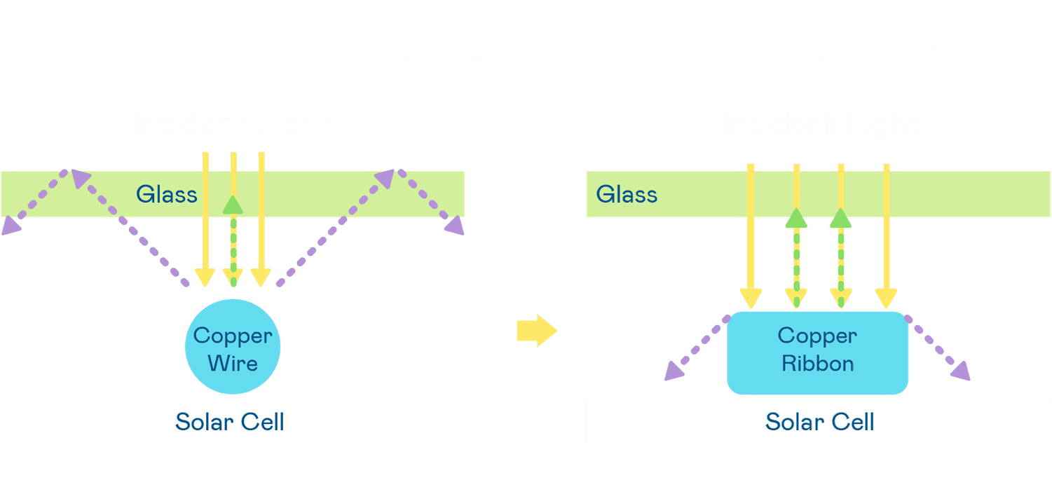 • 电池使用多条铜导线 (Copper wire) 于电池片上形成较短的电流路径,,,,提高电流收集效率,,,采用圆形设计的铜导线较传统扁平式的铜焊带 (Ribbon),,,可增加入射至电池的光线量。。
