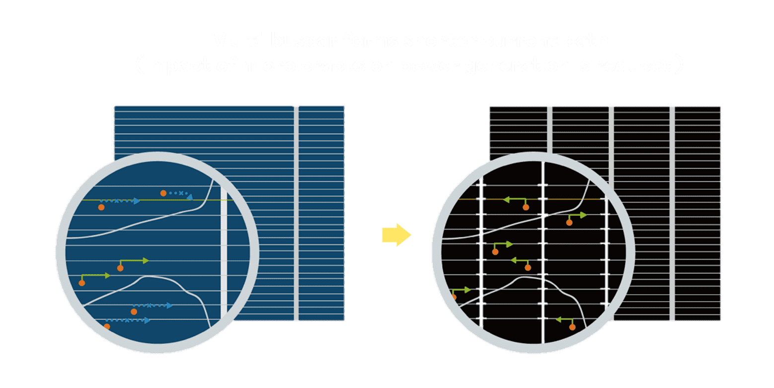 • 多条电极栅结构,,可有效降低外力对于电池的影响,,限制电池隐裂 (Micro-cracks) 范围,,,防止电流传输路径 (Current distribution) 之损坏进一步扩大。。