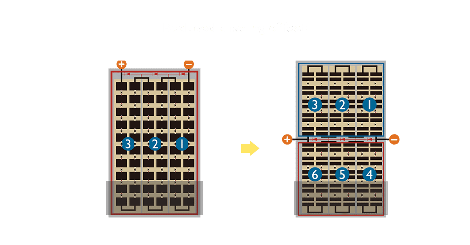 • 结合半切电池,,,,降低遮阴影响、、、提升模组抗隐裂能力、、并减少电阻损耗,,,,进一步提升模组发电效能。。